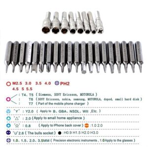 - 38 in 1 interchangeable hardware tools to disassemble and repair iPhone/mobile phone/laptop and other electronic product. You can choose the suitable tools freely according to your needs.