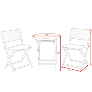 This neat 3 pieces bistro patio set combines with convenience and elegance that will fit and improve any home. It includes two folding chairs and one folding coffee table with black tempered glass. The seat and the backrest are made of textile fiber. The frame of the chairs and table are made out of metal tubular and it is exceptionally sturdy . It enjoyable to have breakfast or afternoon tea in the garden or other outside space with this comfortable and attractive Patio Set which features a simple design. It will be your excellent choice to buy. Do not hesitate to buy it now